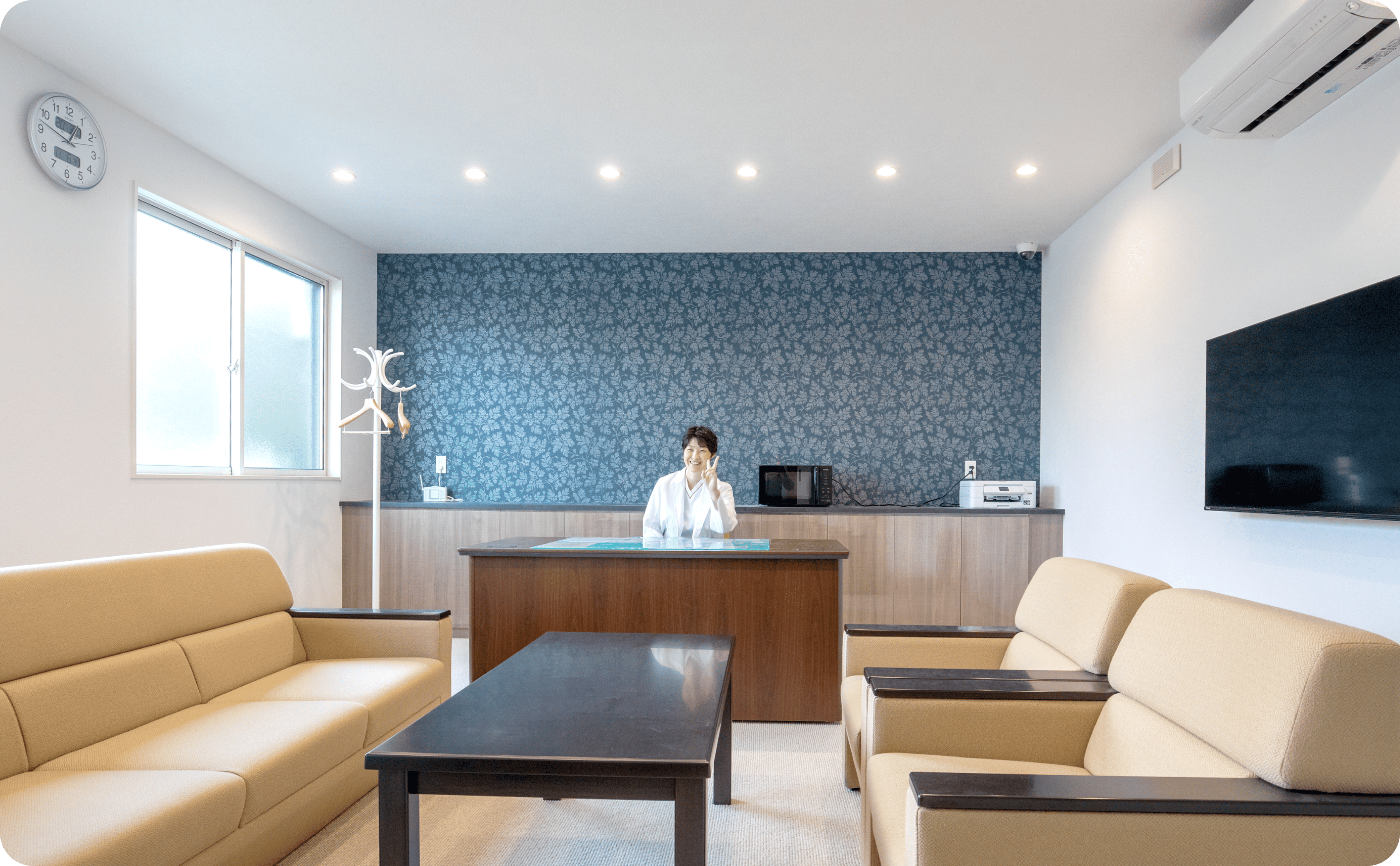 また、地域の方に足を運んでもらえるように、温かみのある待合室を目指しました。セキスイハイムのユニット工法は、壁も柱も最小限なので、開放感があっていいですね。私の好きなグリーンをイメージカラーに、インテリアや看板デザインなども提案してもらいました。 -