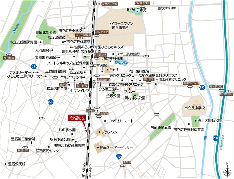 「広丘」駅まで歩いて10分(約770m)。塩尻駅まで乗車5分、松本駅まで乗車14分でアクセスできます。また、歩いて6分(約450m)の「八の字公園」バス停からは、AI活用型オンデマンドバス「のるーと」も利用できます。