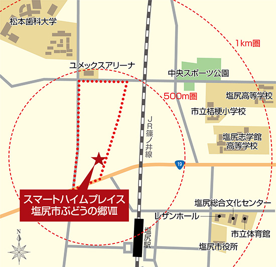 JR中央東線と篠ノ井線のターミナル駅「塩尻」駅へ歩いて12〜13分。塩尻駅を核に、東には市役所や文化会館「レザンホール」、塩尻文化センター、市立図書館などが集まる塩尻市の行政文化ゾーン(※)が広がります。ぶどうの郷ニュータウンの北側には、公園がゾーンが整備され地域の防災拠点でもある「ユメックスアリーナ」、幅広い診療科をそろえ初診受付も可能な松本歯科大学病院(約1.0km)が。