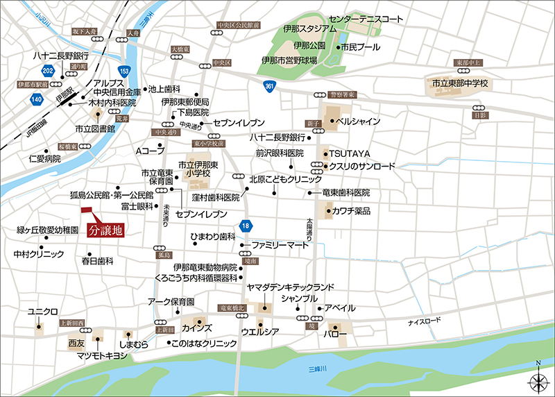 「スマートハイムプレイス伊那市狐島」の立地は、伊那市駅、市役所が直線距離で1km圏内。伊那市の定める中心拠点「都市機能誘導区域(※)」に近く、人口減少の中にあっても、生活利便へのアクセスが容易でハザードリスクが小さく、将来的にコミュニティの持続を確保する「居住誘導区域(※)」に指定されています。中心市街地に近い、便利で恵まれた立地でありながら、西に中央アルプスを遠望する緑豊かな落ち着いた印象が魅力です。
