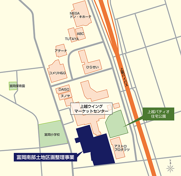 「上越市富岡南部土地区画整理事業」は、地域最大級のショッピングセンター「上越ウイングマーケットセンター」の南に位置し、道路や公園が整備された、上越市で最も新しく住みやすい、区画整理住宅地になります。2025年9月には「上越ウイングマーケットセンター」内に住宅展示場と公園を組み合わせた「上越パティオ住宅公園」がオープン。セキスイハイム信越も新規出展しました。