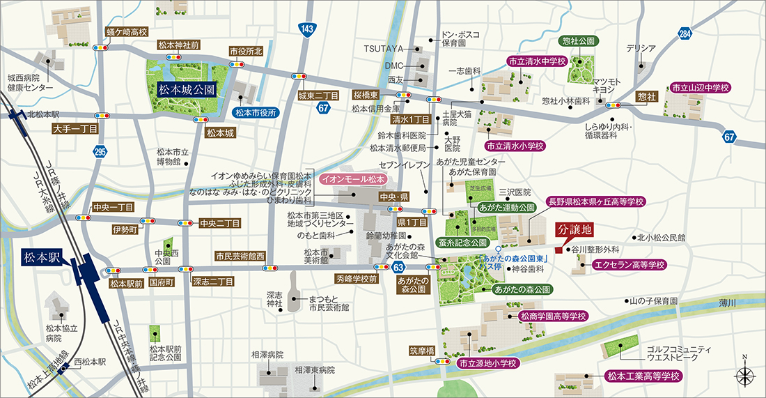 松本市の中でも、松本城~松本駅~あがたの森を中心とする中心市街地は、松本広域都市圏の中心拠点として多様な都市機能を集約し、利便性が高く、また文化を楽しめるまちを目指す地域です。中でも「あがたの森」周辺は、松本城周辺地区と合わせて「歴史・文化・観光拠点」として位置付けられています。分譲地から「あがたの森」まで約250m。あがたの森には旧制松本高等学校(現あがたの森文化会館)があり、分譲地周辺には徒歩5分圏に3つの高校、1km圏に保育園・幼稚園・小中学校を擁する、学都まつもとを象徴する文教ゾーンと言えます。