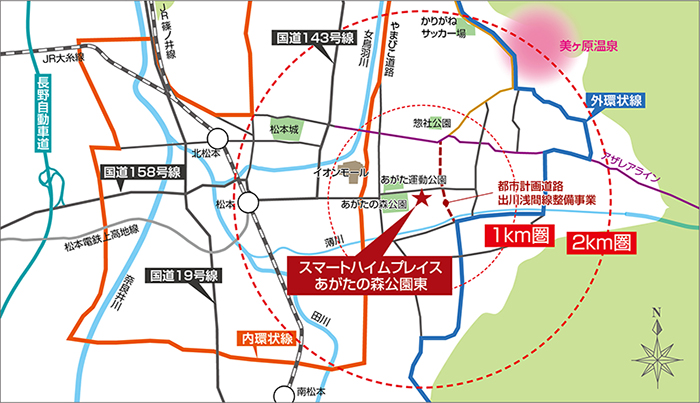 また、分譲地の東では、都市計画道路「出川浅間線整備事業」(※2)が進行中。薄川の南を走る「アルプス展望しののめのみち」の「南小松」交差点から「惣社」交差点付近がつながる予定です。薄川を越える橋梁の新設と両側歩道を設けた幅員12mの新設道路が、外環状線を構成し、市南北へのアクセスをさらにスムーズにしてくれそうです。