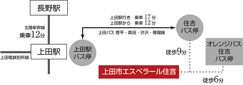 分譲地から最寄りの「住吉」バス停まで徒歩9分。上田バスの傍陽線・菅平線・真田(渋沢)線の3路線が利用でき、上田駅まで乗車17分、上田駅から12分の乗車時間です。上り34本、下り36本運行していますので、通勤・通学にも便利に利用いただけます。また、市内各所への移動にはオレンジバスも利用でき、「住吉」バス停まで徒歩6分です。