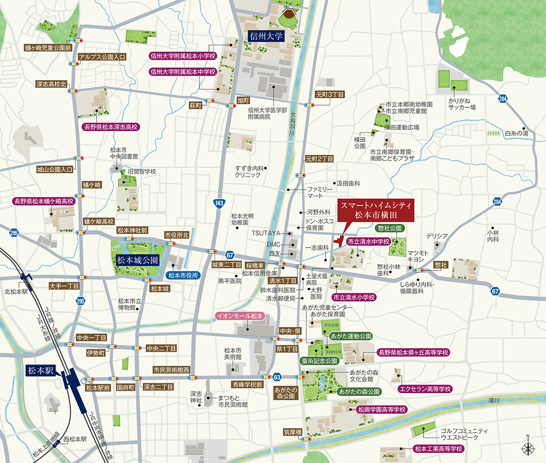 「スマートハイムシティ松本市横田」の入口からアザレアライン(県道67号線)「清水二丁目」交差点まで約210m。やまびこ道路(市道2057号線)「桜橋東」交差点まで約550m、国道143号線「城東二丁目」交差点まで約1kmという恵まれたポジションです。中心市街地へのアクセスが良く、長野自動車道・松本ICへも車で20分(約5.4km)です。また、都市計画道路「出川浅間線整備事業」(※)が進行中。薄川の南を走る「アルプス展望しののめのみち」の「南小松」交差点から「惣社」交差点付近がつながる予定です。薄川を越える橋梁の新設と両側歩道を設けた幅員約12mの新設道路が、周辺道路の渋滞を緩和するとともに、市南部へのアクセスをさらにスムーズにしてくれそうです。