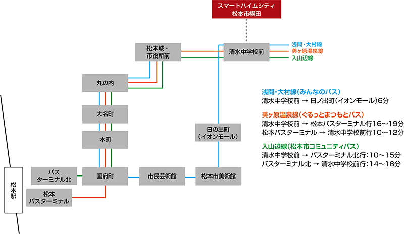 最寄りの清水中学校前バス停まで5〜6分。松本市の公設民営「ぐるっとまつもとバス」美ヶ原温泉線が利用でき、松本バスターミナルまで16~19分、バスターミナルから10~12分の乗車時間です。上り下り合わせて1日70便運行しており、さらにアルピコ交通・浅間・大村線、松本市コミュニティバス・入山辺線も利用でき、イオンモールや市役所方面への移動にも便利です。