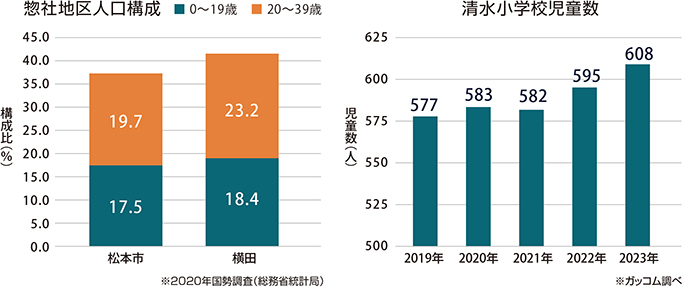 アザレアラインの北、女鳥羽川の東に広がる「横田」。人口減少に転じた松本市において横田地区は人口増加傾向にあり、世帯増加の伸び率も松本市平均を上回っています。世代別に見ると20~30歳台の人口比が平均より4ポイント近く多く、清水小学校の児童数も増加していることから、若年世代の多い活気あるエリアだと言えそうです。