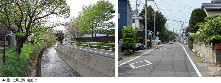 美ヶ原山麓に源を発する湯川。里山辺から桜橋北側で女鳥羽川に合流する湯川は、緑多い閑静な住宅地を縫うように流れ、歩行者用の小径や桜並木が見られるところなど、潤いある風景を生み出しています。そんな穏やかな風景に寄り添うように、「スマートハイムシティ松本市横田」が広がっています。