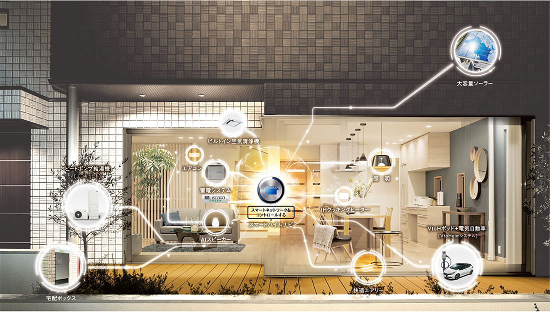 忙しい毎日の暮らしをサポート!スマートハイムナビを中心とした住宅設備と電力の、新しいネットワークが毎日の暮らしにゆとりをプラスします。