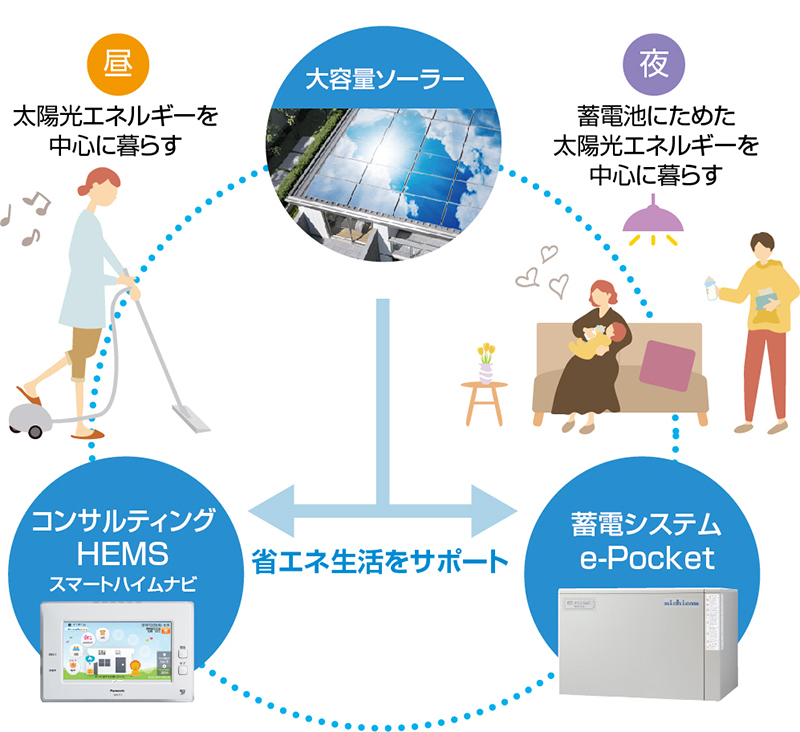 大容量ソーラー+蓄電池+スマートハイムナビの3点セットを標準搭載。長時間の停電にも強い、エネルギー自給自足型の暮らし(※)を実現します。