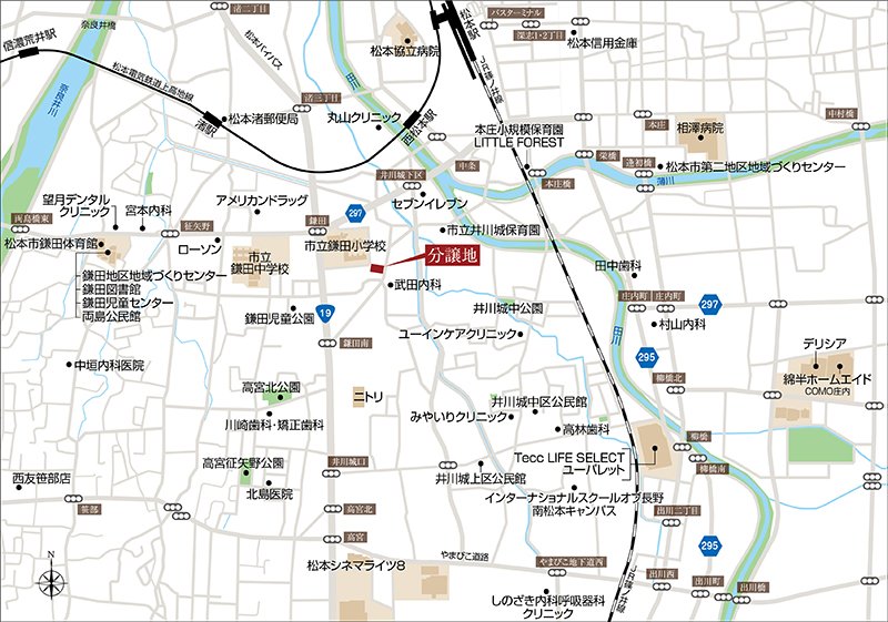 分譲地から松本市を縦断するメイン幹線・国道19号線(松本バイパス)「鎌田南」交差点まで車で1分(約370m)、鎌田交差点まで2分(約450m)。県道297号線経由で中条跨線橋を越えれば中心市街地です。さらに北上し、国道158号線と143号線と交差する「渚1丁目」交差点まで約1.4km。国道158号線経由で長野自動車道・松本ICへ車で10分(料金所まで約3.4km)。市内アクセスはもとより広域アクセスも良好です。