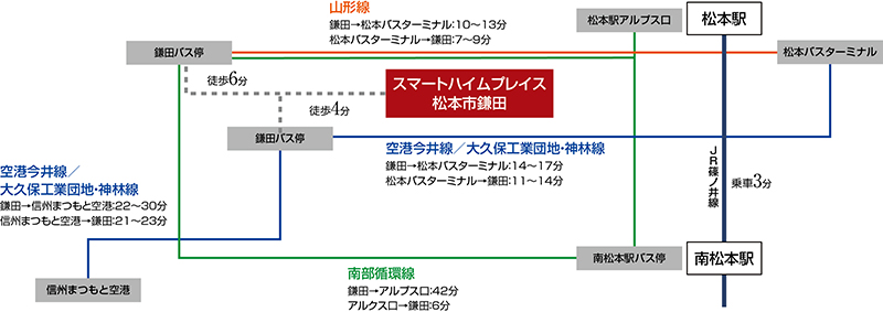 最寄りの「鎌田」バス停(市道5501号線側)まで歩いて6分。アルピコ交通「山形線」乗車10〜13分で「松本駅バスターミナル」に接続。徒歩4分の「鎌田」バス停(国道19号線側)からは「空港・今井線」が利用でき、「松本バスターミナル」へ乗車14~17分、「信州松本空港」へ22~30分でアクセスできます。また松本市の南部市循環線も運行しており、南松本駅方面の利用が可能。通勤・通学、休日のお出かけにも便利に利用いただけます。