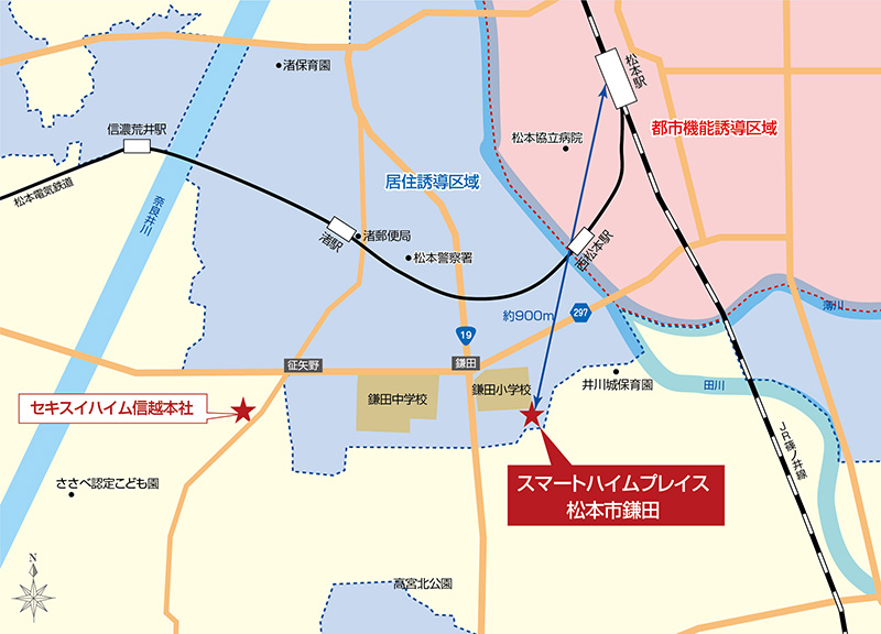 「スマートハイムプレイス松本市鎌田」は、松本駅から直線距離で約900m。松本市の「居住誘導区域(※)」に指定されています。居住誘導区域とは、人口減少の中にあっても、生活サービスやコミュニティの持続が確保されるように居住を誘導する区域であり、生活利便へのアクセス面やハザードリスク等を考慮して決められています。加えて、薄川が田川に合流するラインを越えれば松本市の中心拠点「都市機能誘導区域(※)」ですから、比較的、落ち着いた環境にありながら、中心市街地に近い、便利で恵まれた立地だといえるでしょう。