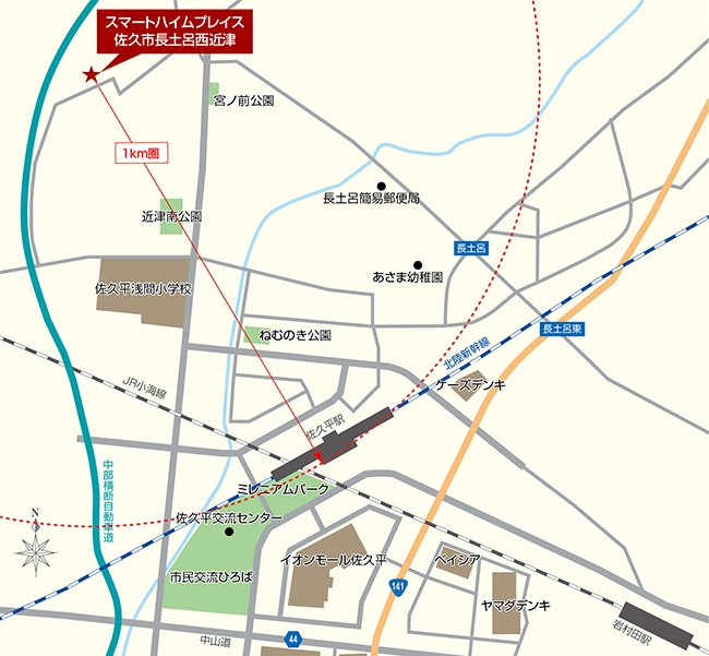 国道141号線「長土呂東」交差点まで約1.4m。中部横断自動車道の小諸方面・八千穂方面乗り口まで約3.5km、車で7分のアクセスです。また、上信越自動車道「佐久IC入口」交差点へも車で8分(約3.3km)。主要幹線への接続の良いポジションで、佐久市内はもちろん軽井沢や上田、蓼科、白樺湖などへのアクセス、さらに広域ネットワークにも快適につながります。