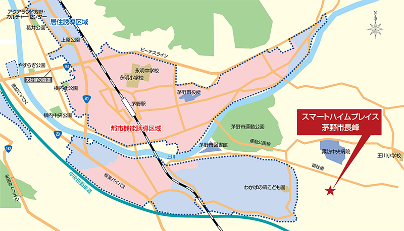 茅野市運動公園を取り巻く市街地住宅地の周縁に位置する「スマートハイムプレイス茅野市長峰」。田園的環境との調和を図りながら居住環境の維持・向上を図る「緑と人の農住共生ゾーン」に位置付けられています(※)。農住共生ゾーンの中でも広域医療・福祉拠点となる「諏訪中央病院」、地域コミュニティ拠点となる「玉川コミュニティセンター」、玉川工業団地にもほど近い自然の残る落ち着いた環境に包まれた穏やかな暮らしのステージです。