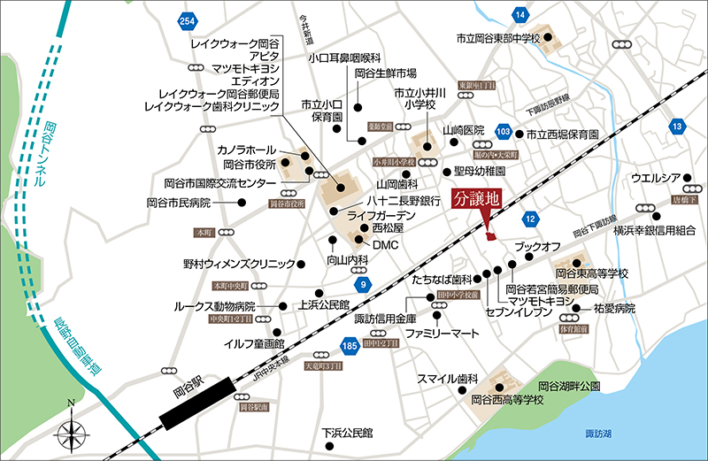 JR中央本線「岡谷」駅より北東約2kmに位置し、諏訪湖畔に近接する市街地。南アルプスを遠望する緑ゆたかな潤いとやすらぎのある恵まれた環境にありながら、レイクウォーク岡谷が徒歩圏に。他にも多彩な商業施設をはじめ、教育機関や医療機関が周辺に充実する暮らしやすいに立地です。
