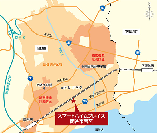 「スマートハイムプレイス岡谷市若宮」は、岡谷市の「居住誘導区域(※)」に指定されています。「居住誘導区域」は、中心拠点に比較的容易にアクセスでき都市機能を利用できる区域で、土砂災害などハザードリスクの⾼い地点が除かれていることから、「便利に安心して暮らせる」居住環境としての基本条件を備えた地域だと言えます。さらに、住環境の改善を図るための「湖畔若宮地区地区計画」が定められており、安全で良好な環境形成のために建築物等に制限が設けられています。