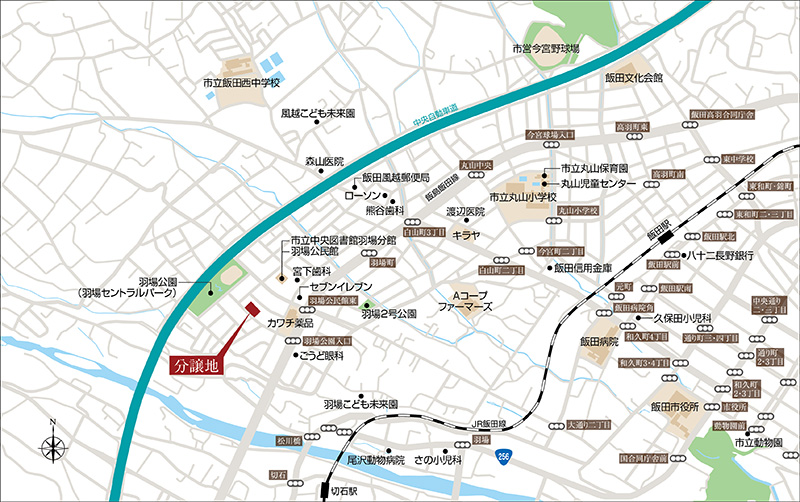 分譲地から県道15号線・飯島飯田線「羽場公園入口」交差点まで約180m、県道15号線を北上して太平街道まで車で2分(約720m)、南下すれば鼎さわやかロード「切石体育館前」交差点まで車で2分(約820m)。さらに進めば飯田バイパス「飯田インター東」交差点に接続する、恵まれたアクセスポジションです。中央自動車道の飯田インター料金所まで車で6分(約2.5km)ですから、広域アクセスも良好です。