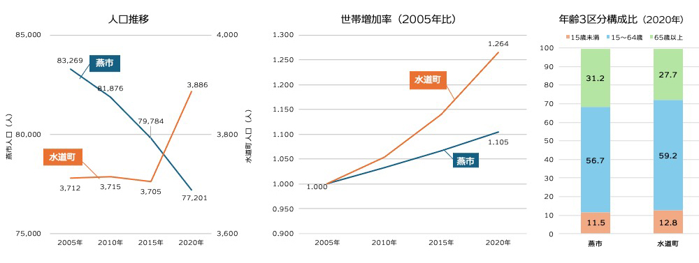 水道町は住居系用途地域内の比較的ゆとりある良好な居住環境が評価されて宅地化が進み、人口・世帯数が増加しています。燕市全体では人口が減少していますが、水道町は2015~2020年に大きく増加。世帯数も2020年には2005年の1.2倍超になっています。また、年齢構成も全市に比べ15歳未満および15-64歳の生産労働人口比率が高く、比較的若い世代が多く活気あるエリアだと言えそうです。