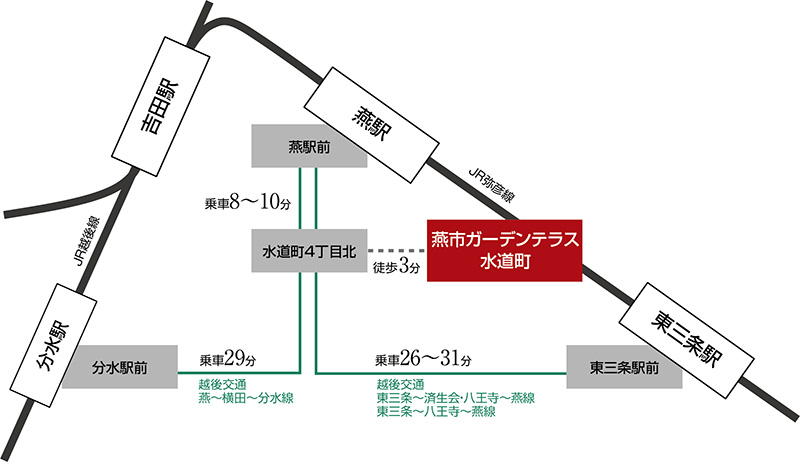 「水道町4丁目北」バス停まで徒歩3分。JR弥彦線の燕駅まで乗車8~10分、東三条駅まで乗車26~31分、JR越後線の分水駅まで乗車29分でつながります。
