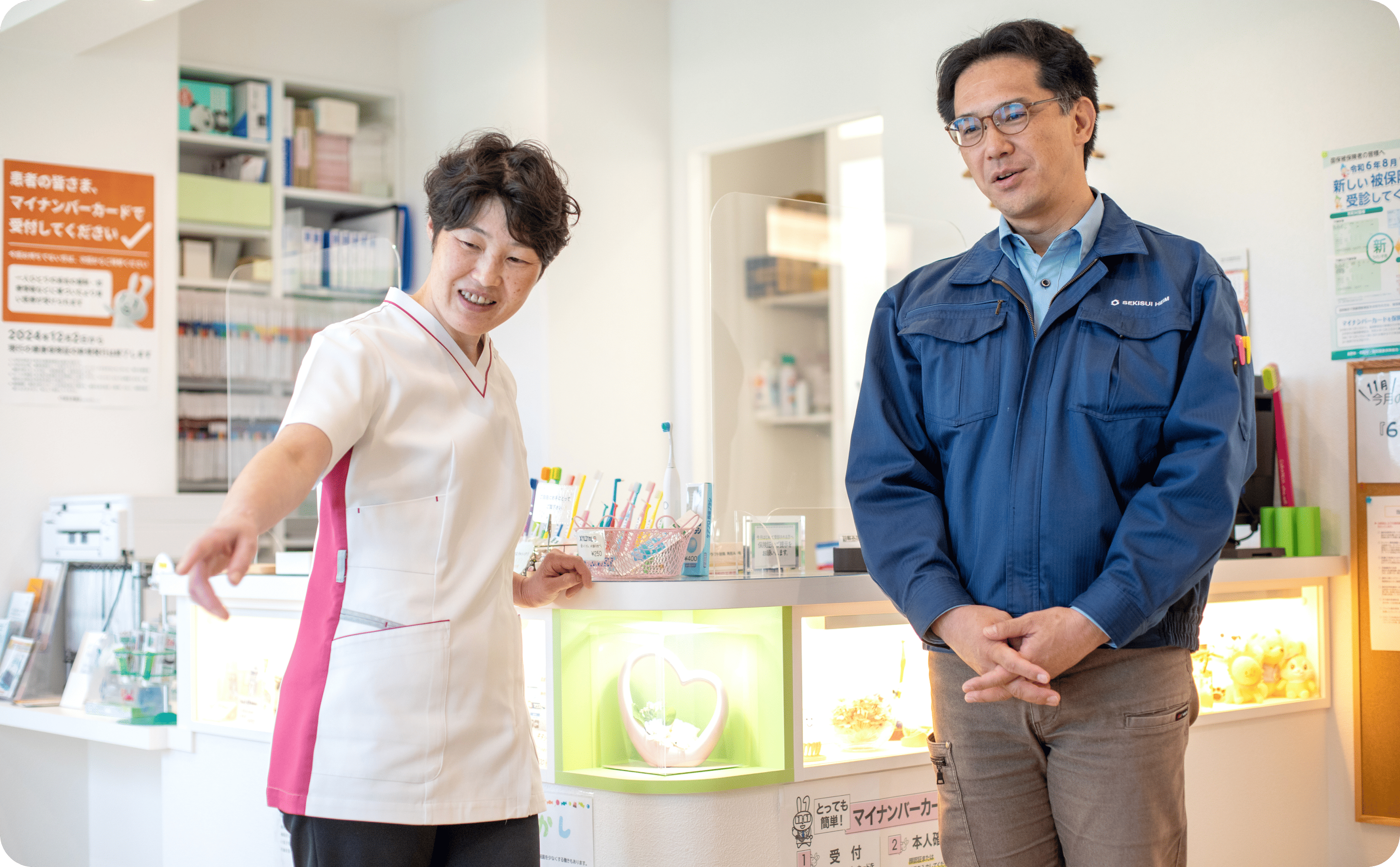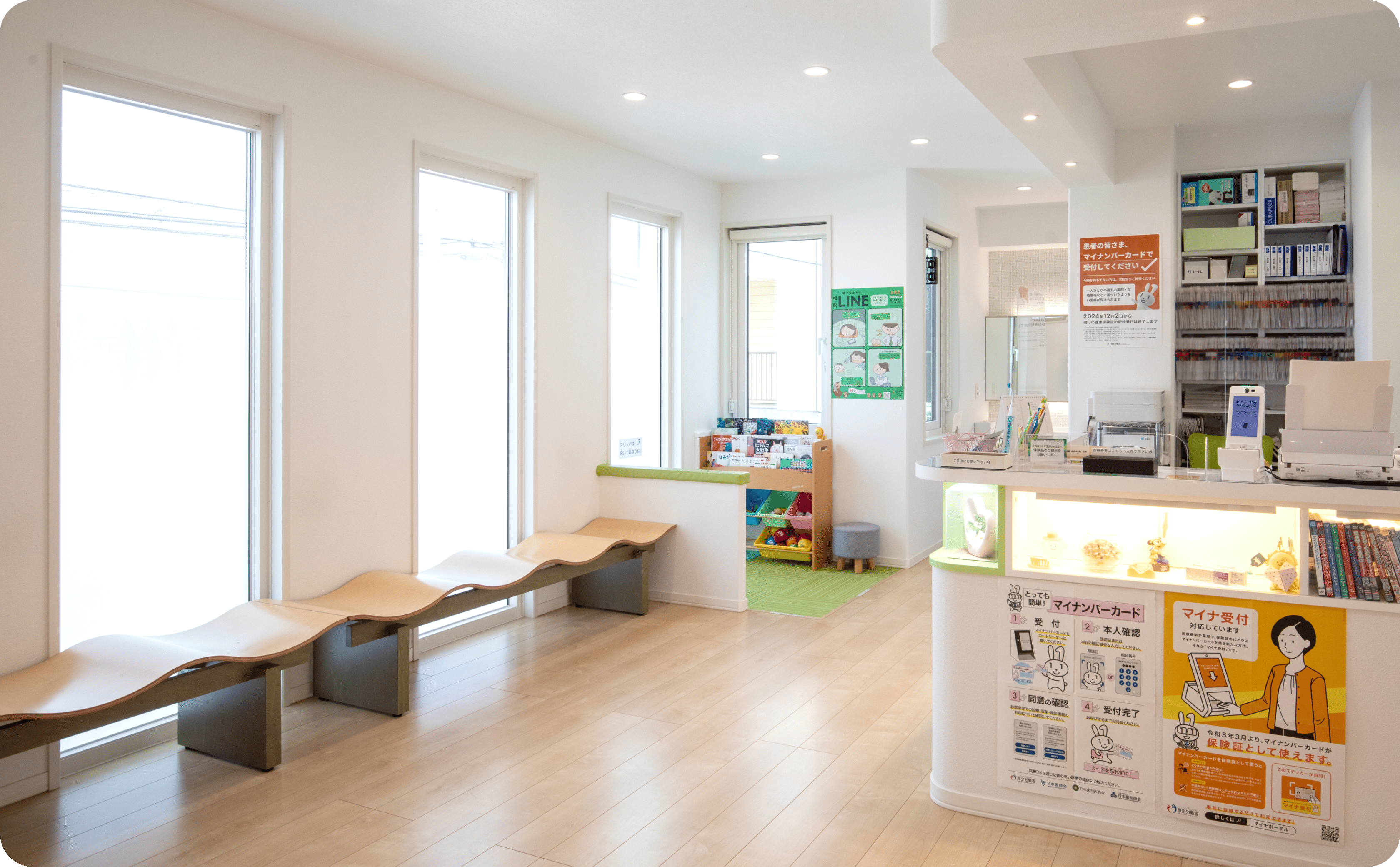 また、地域の方に足を運んでもらえるように、温かみのある待合室を目指しました。セキスイハイムのユニット工法は、壁も柱も最小限なので、開放感があっていいですね。私の好きなグリーンをイメージカラーに、インテリアや看板デザインなども提案してもらいました。