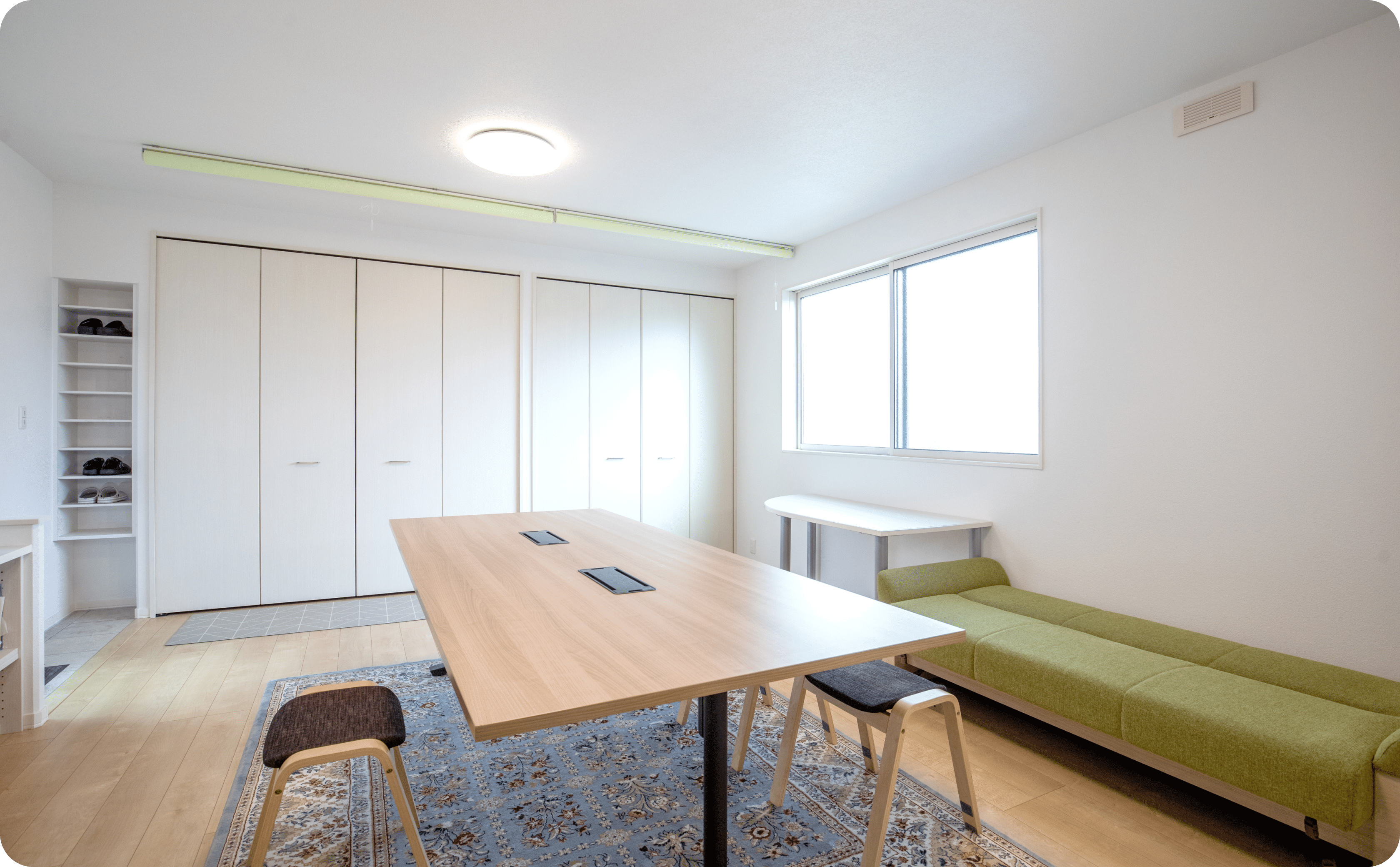 スタッフルームは、スタッフが休憩時間にリラックスできるように広めに設計してもらいました。室内の更衣スペースについては、壁をつくるのではなく、ロールスクリーンで目隠しをすることで、空間を柔軟に使えるようになっています。